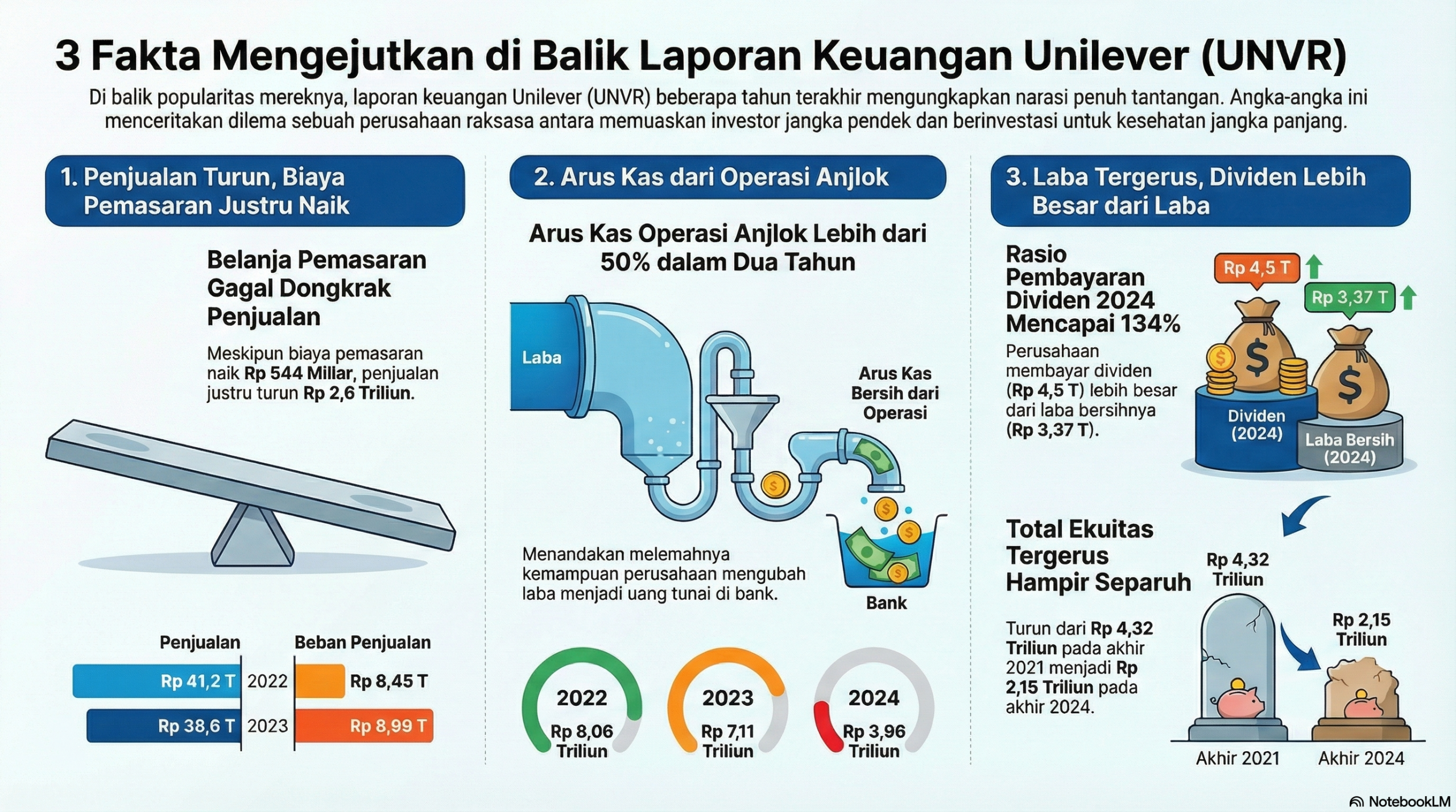 Hampir setiap rumah tangga di Indonesia mengenal produk Unilever (UNVR). Namun, di balik popularitasnya, laporan keuangan beberapa tahun terakhir mengungkapkan sebuah narasi penuh tantangan yang jarang disadari publik. Angka-angka ini menceritakan kisah dilema strategis sebuah perusahaan raksasa: antara memuaskan investor jangka pendek dan berinvestasi kembali untuk kesehatan jangka panjang di tengah tekanan operasional. Artikel ini akan mengungkap tiga temuan paling signifikan yang menjadi gejala dari dilema tersebut.